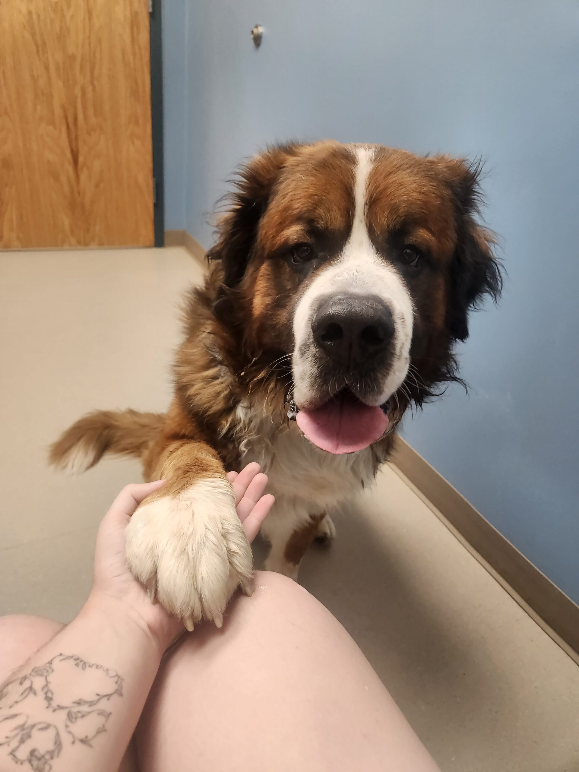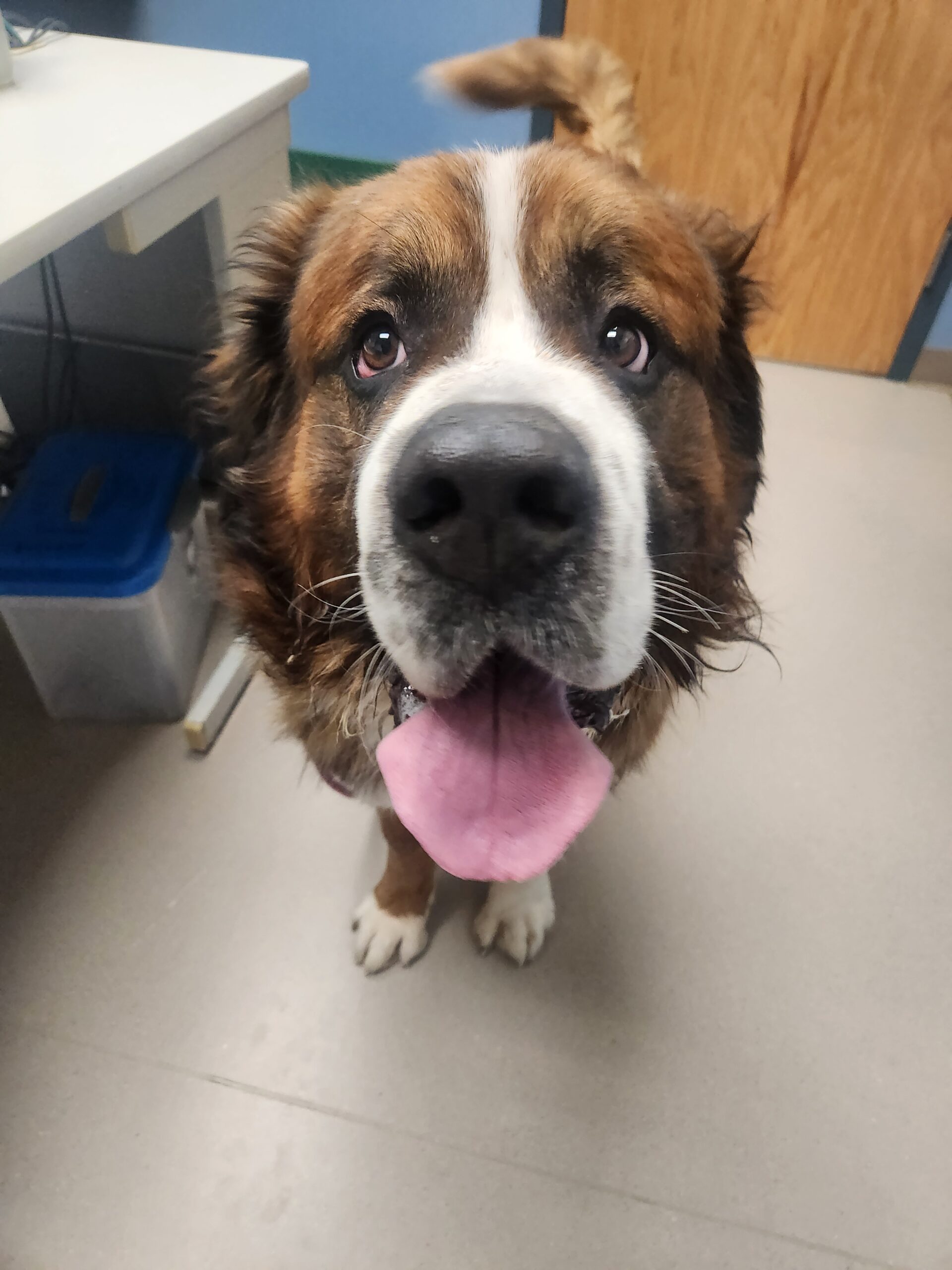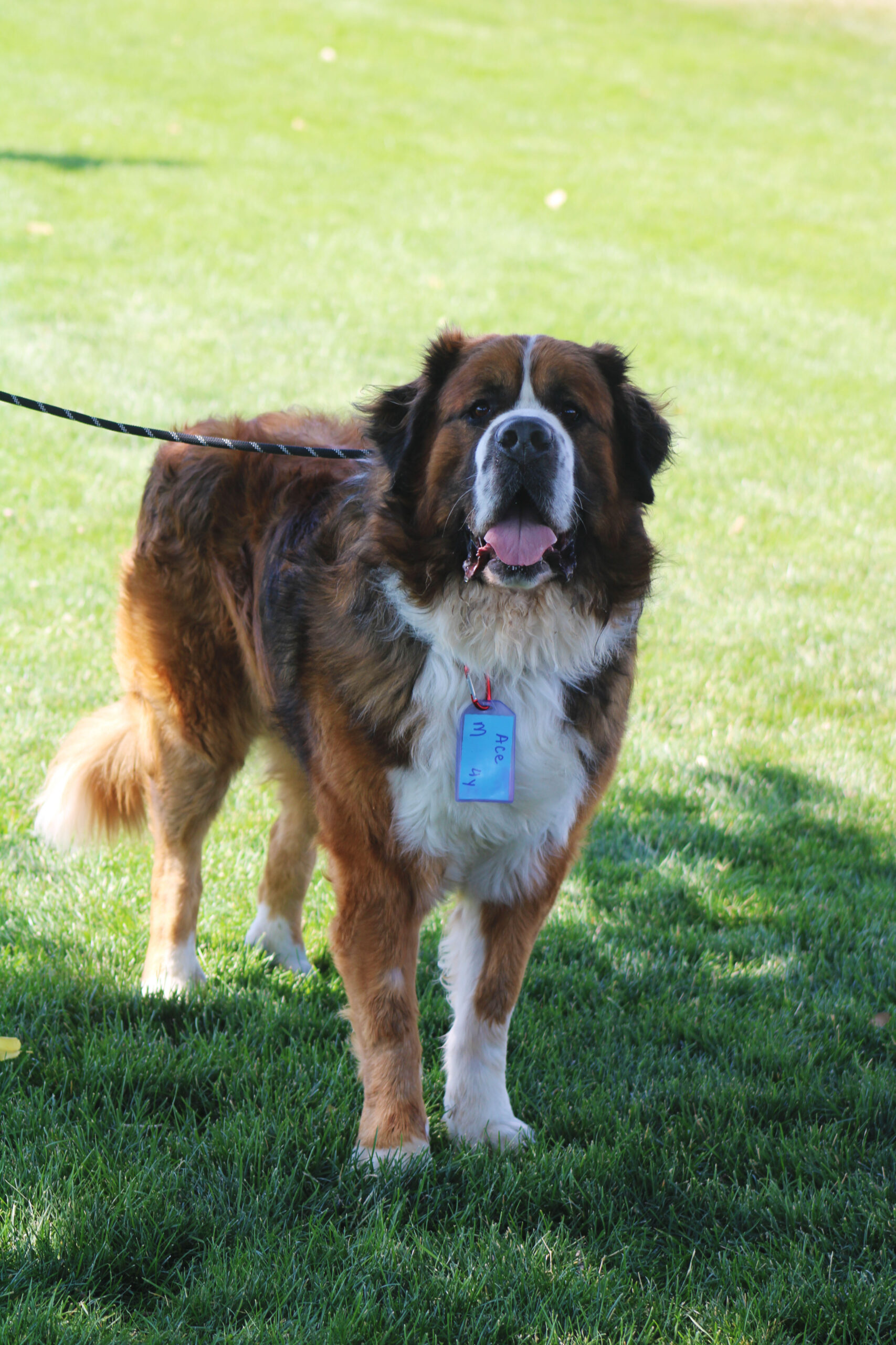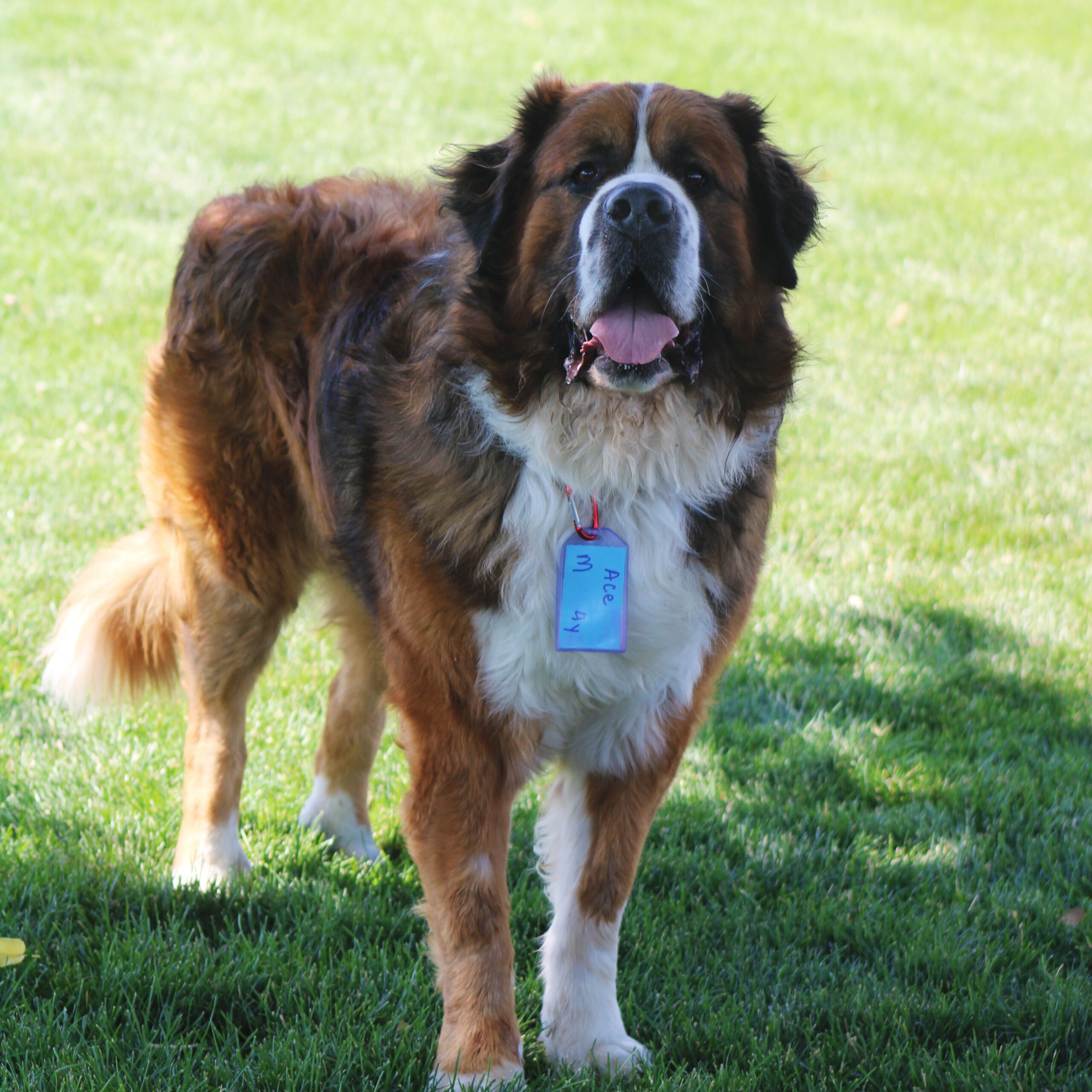 If you're looking for the perfect card to fit in with the rest of your deck, look no further than Mr. Ace. Ace might be a big boy, but don't let that deter you, he is truly the sweetest, goofiest Saint Bernard mix. He's got the gentlest mouth when taking treats from someone - but prepare for a little drool! ;) On top of being super gentle, he also loves his butt scratches and is pretty comfortable with being handled by our volunteers. He does know how to sit (and is working on "shake") and will probably pick up other tricks quickly in return for a treat! All of our volunteers are absolutely in love with him. We think Ace would be suited in just about any home. He doesn't quite realize his size, so he will need someone willing to help him learn about boundaries and how big he really isa! (especially if there are smaller animals and kids present in the household).