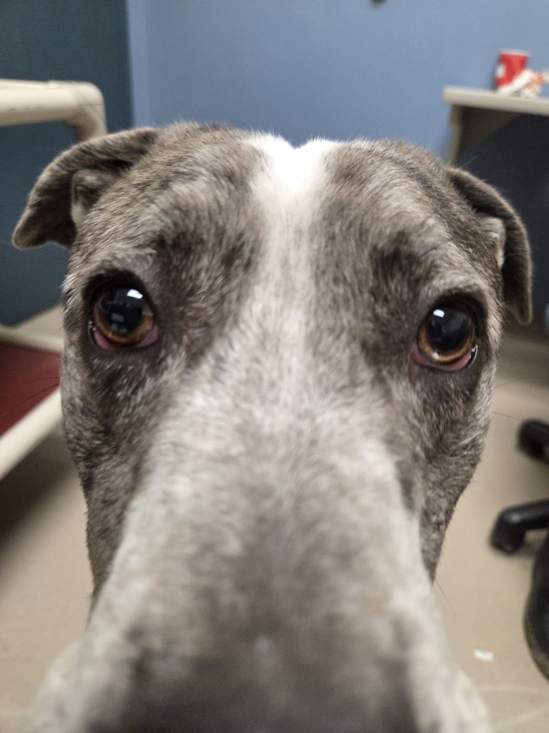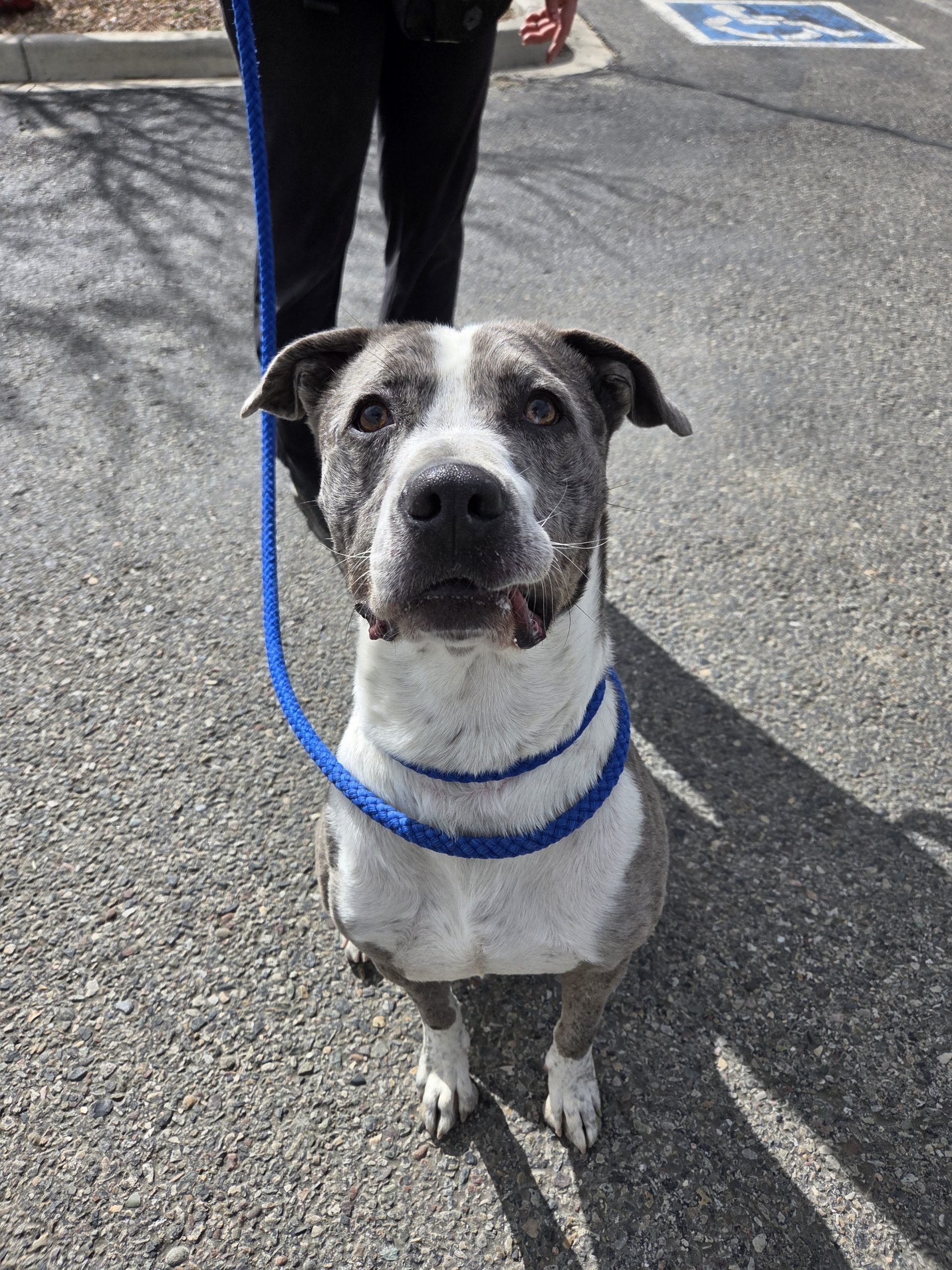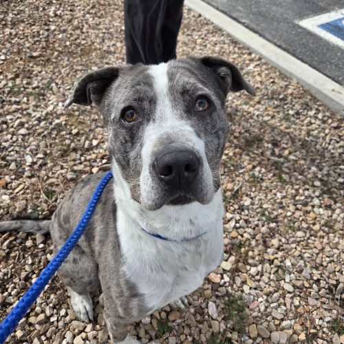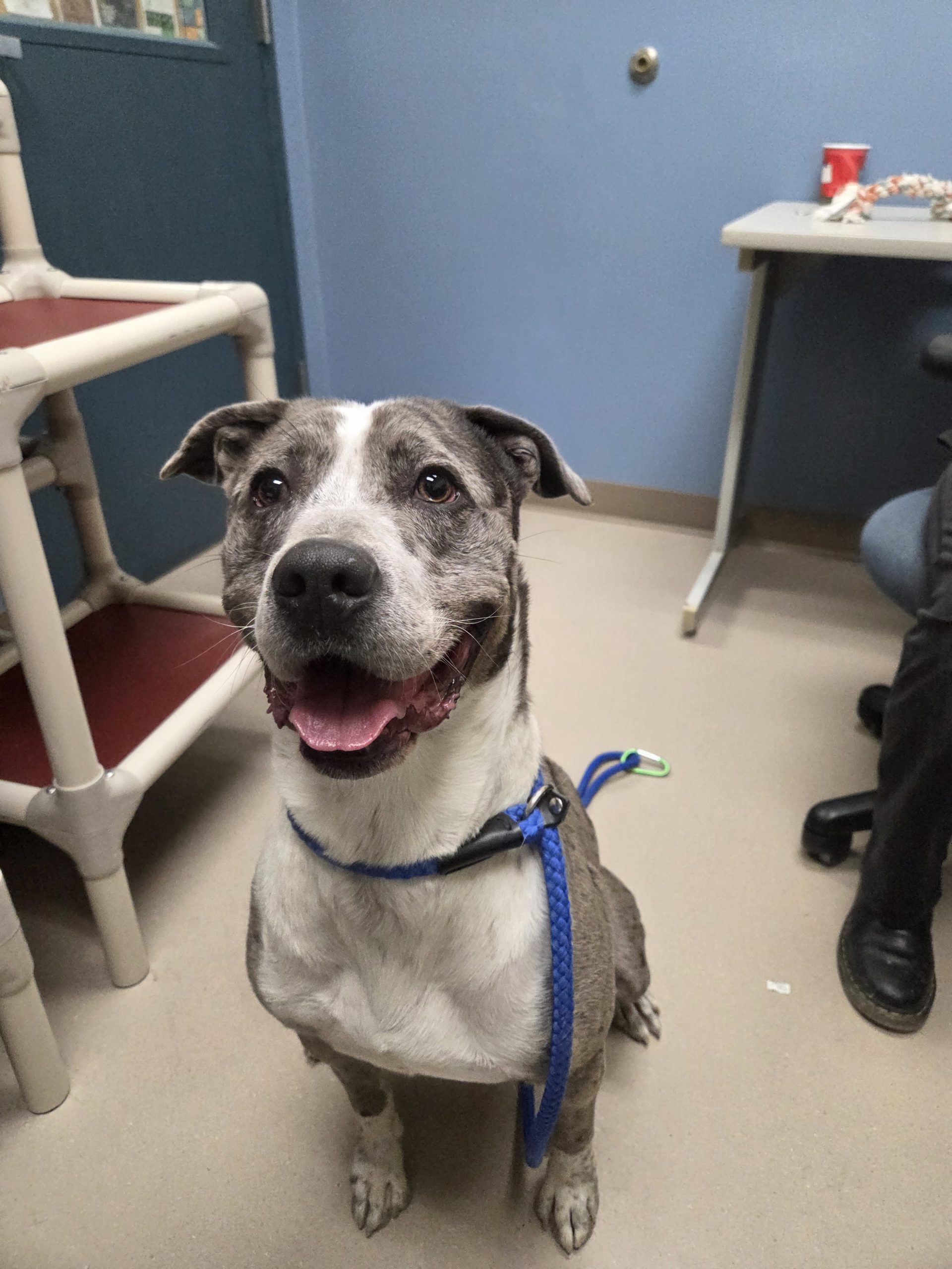 He is crate-trained and enjoys playing tug-o-war or fetch with you! He knows "drop it" and gently drops the ball close to you. He will do well with hiking, biking, running, but these are not essential. You could also take him on nice walks, he can play with your dog, or you can play fetch with him on a regular basis. He makes cute gremlin noises when playing. He pulls some on leash but does better in a calmer environment (than our events). He also performs well with a harness on. Higgins likes other friendly dogs and would enjoy a playmate. He even understands that everyone has different levels of how rough they want to play and adjusts to it.