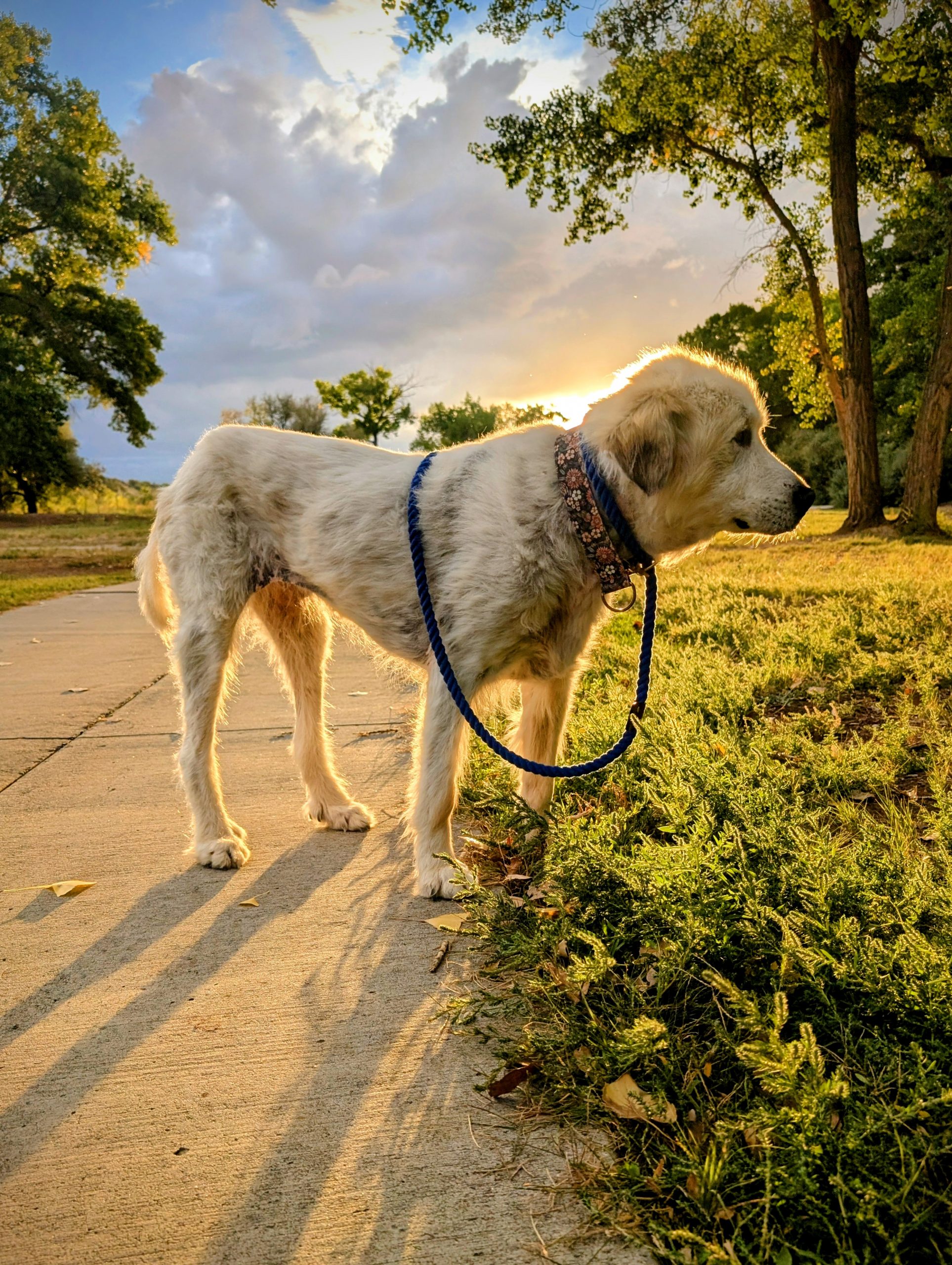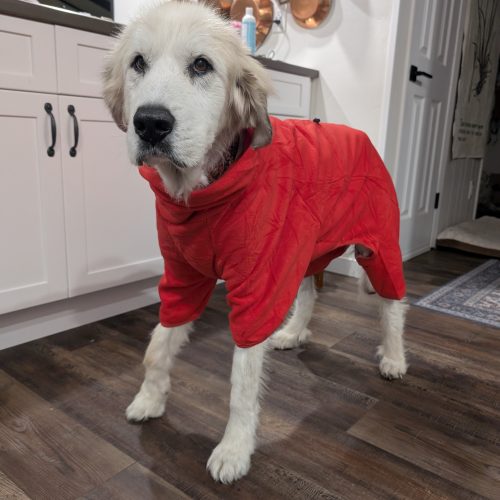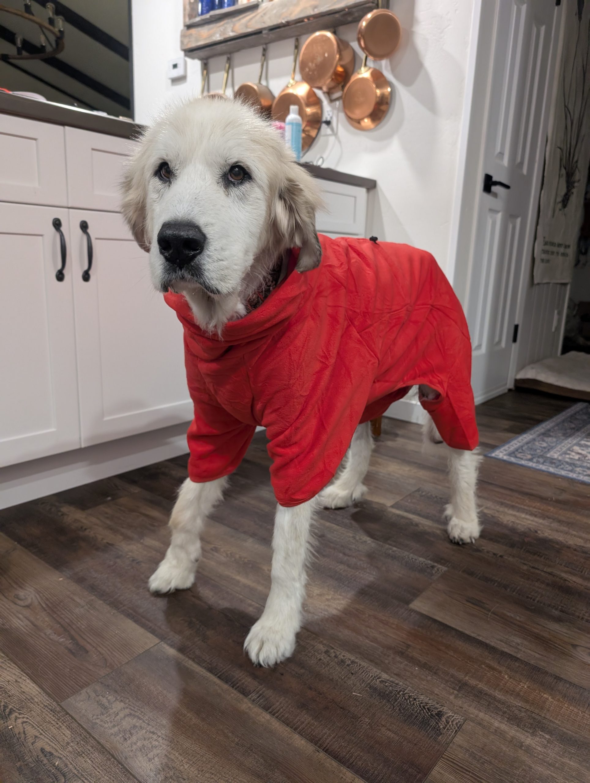 Maddy was found as a stray in really poor condition, covered in mange and malnourished.You could tell she lived outside and was probably neglected for all or most of her life. MCAS nursed her back to health and was able to quarantine her while they got rid of the mange and healed her skin and now she is in foster and THRIVING! Despite her rough life, Maddy is the sweetest giant granny! She loves all the LOVE and wants to be near her person all the time. She will gently lean into you and everyone she meets to let you know that she would like some more pets. She is potty trained, knows how to use a dog door, food motivated, and does great with other dogs, cats, poultry and probably kids! She will probably need a home with little to no stairs as she ages. She’s currently in foster and walking about 2 miles almost every day. She’s getting stronger, building muscle and is starting to have some pep in her step! This old gal needs to be with a family who will SPOIL her for the rest of her golden years.