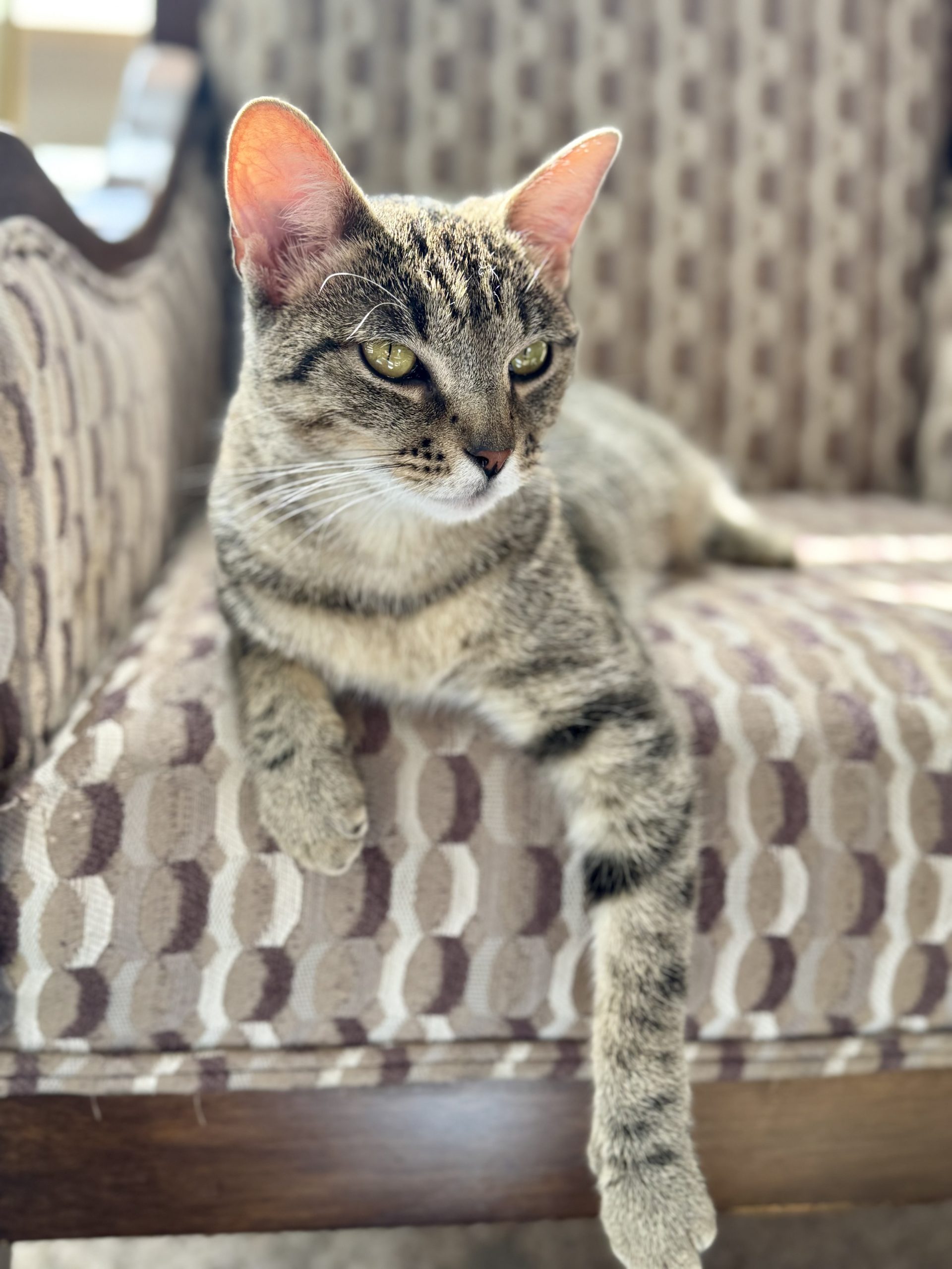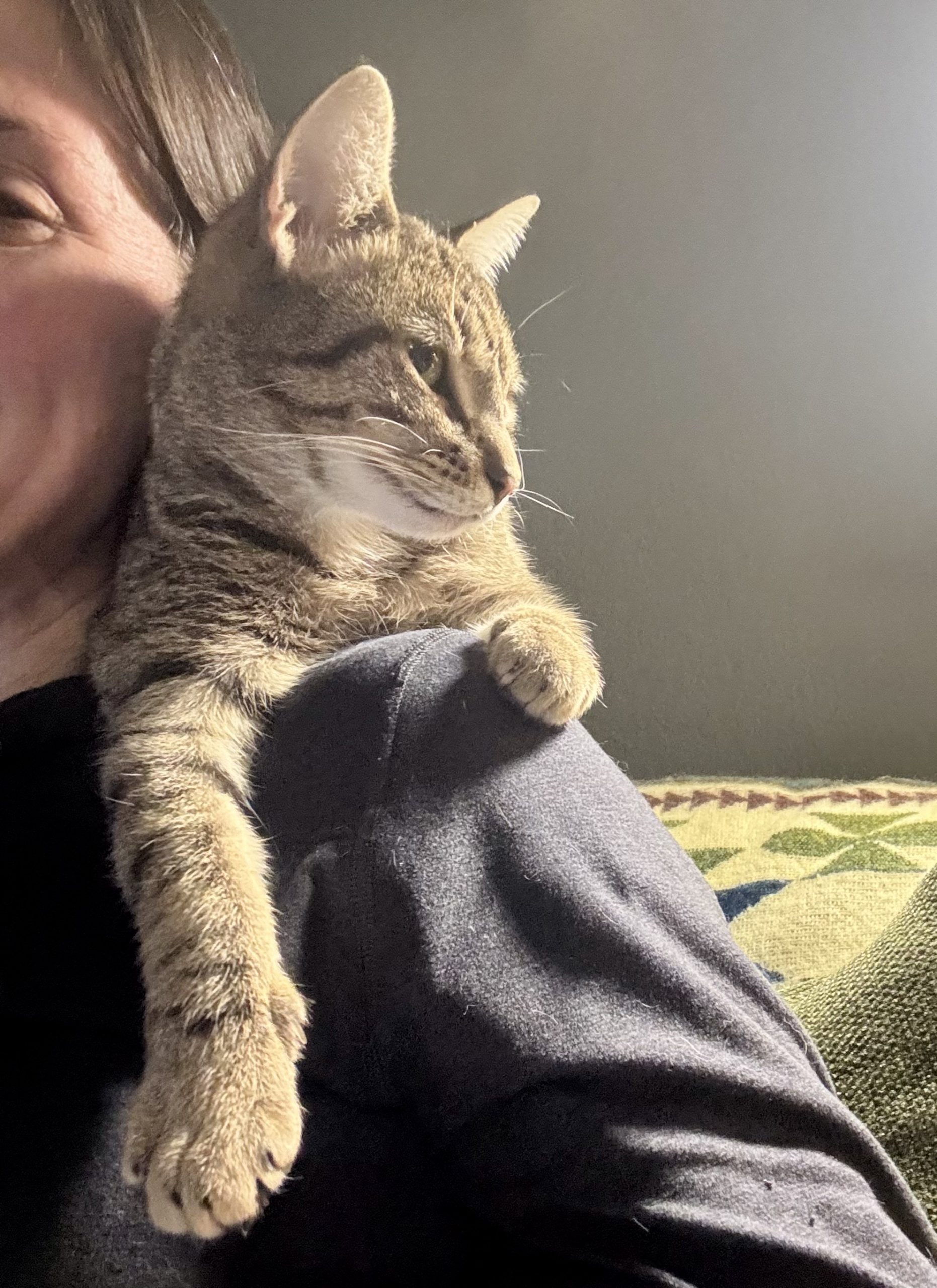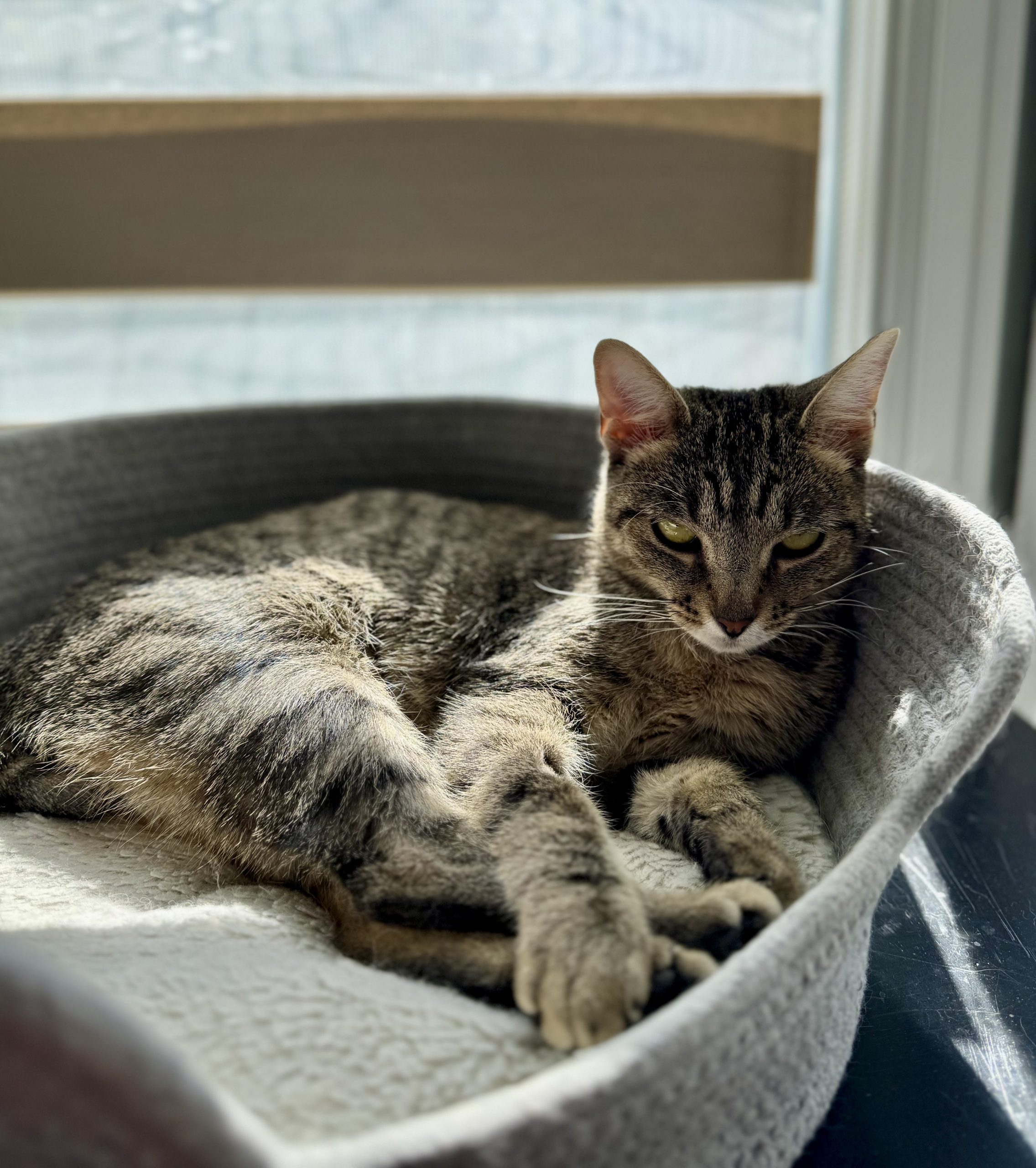 Abba is a snuggly, affectionate, quirky and playful petite cat. She loves napping in your lap, draping herself across your shoulders and burrowing as close as she can get while you sleep. She is young and gently bites during play so would be best in a home with adults or older children. She gets along with most cats and sports the cutest recently bobbed tail that still seems to surprise her when she notices it's partially missing. If you're looking for a spunky lovebug, she's your gorgeous girl.