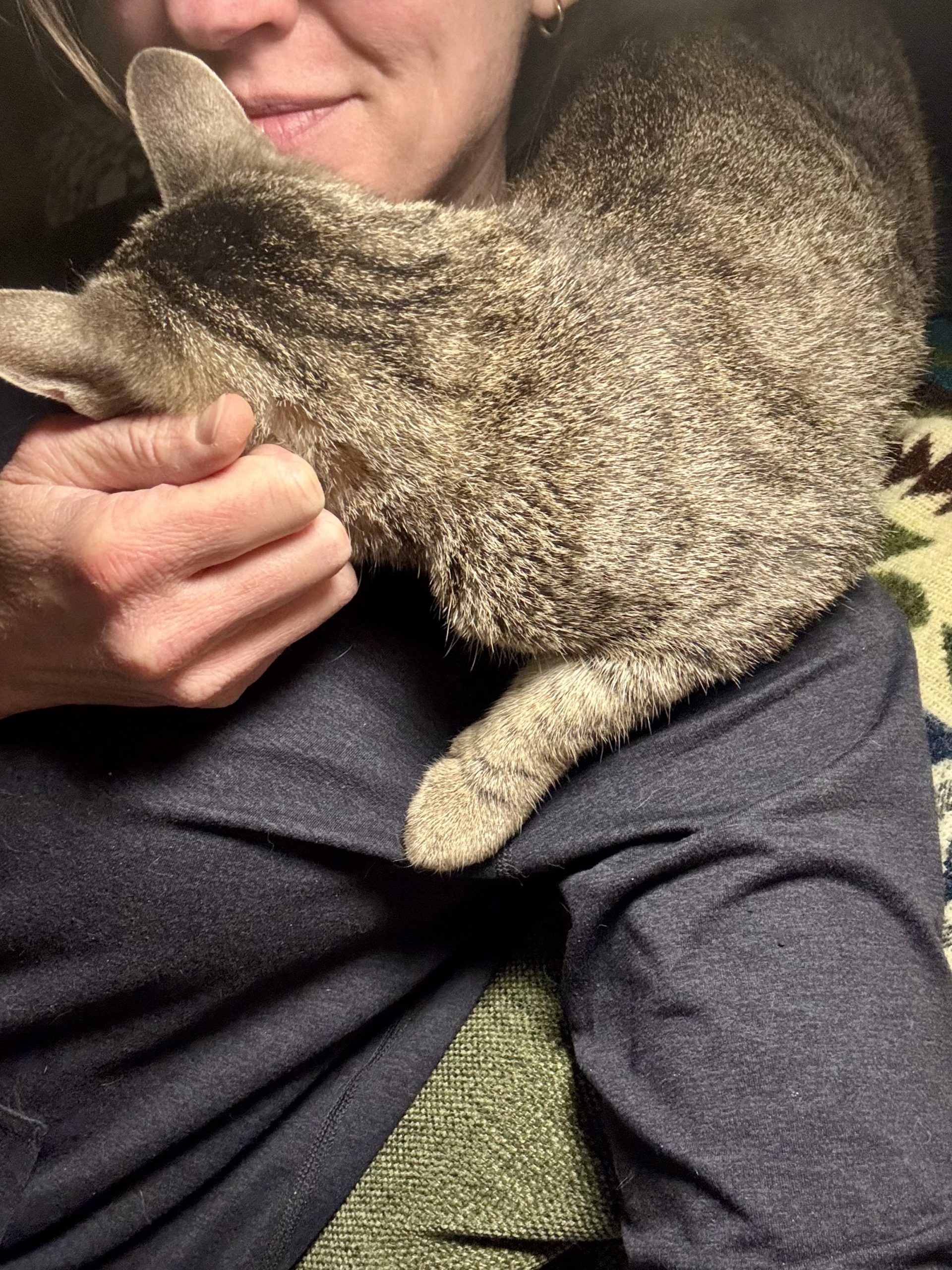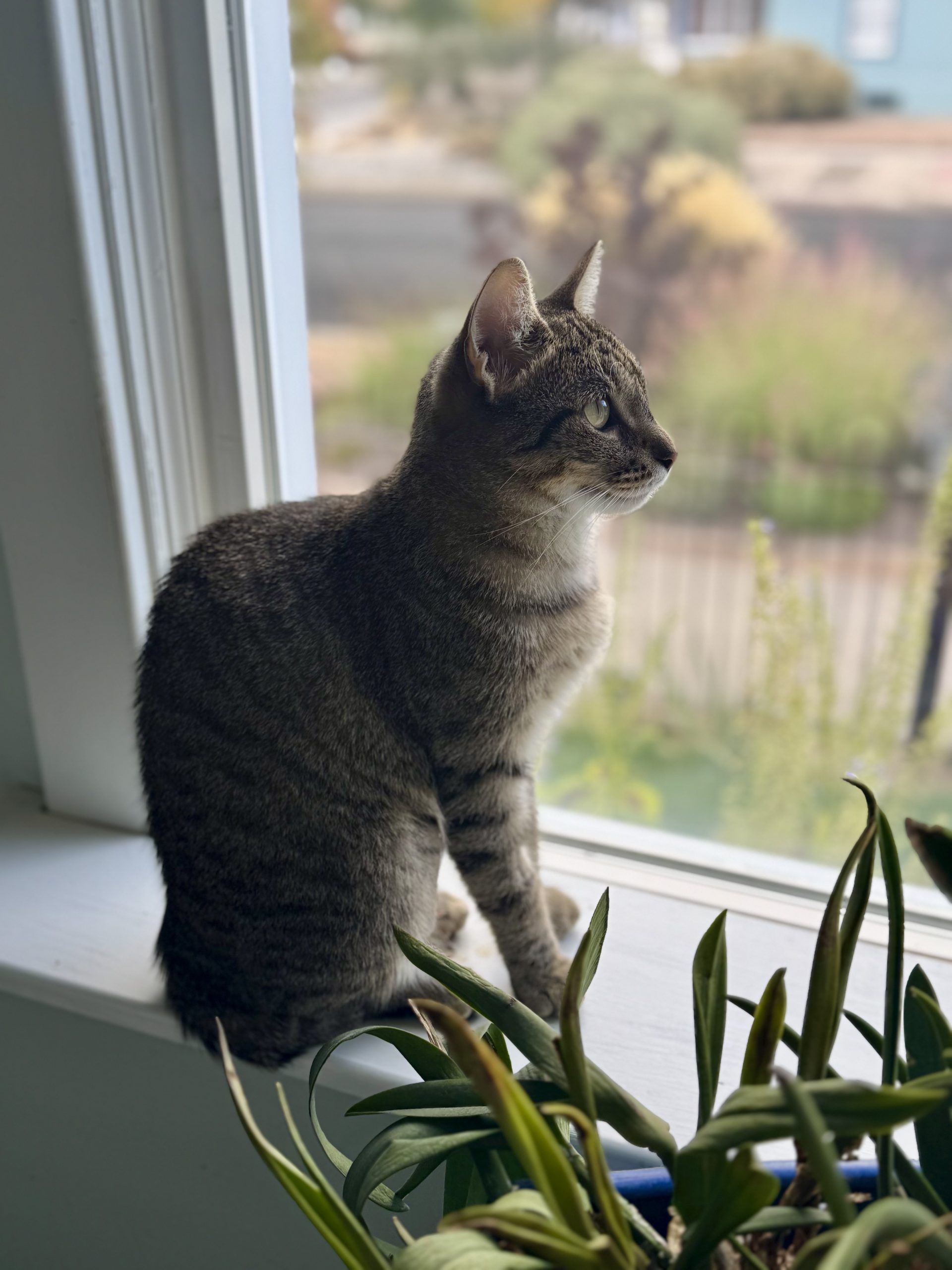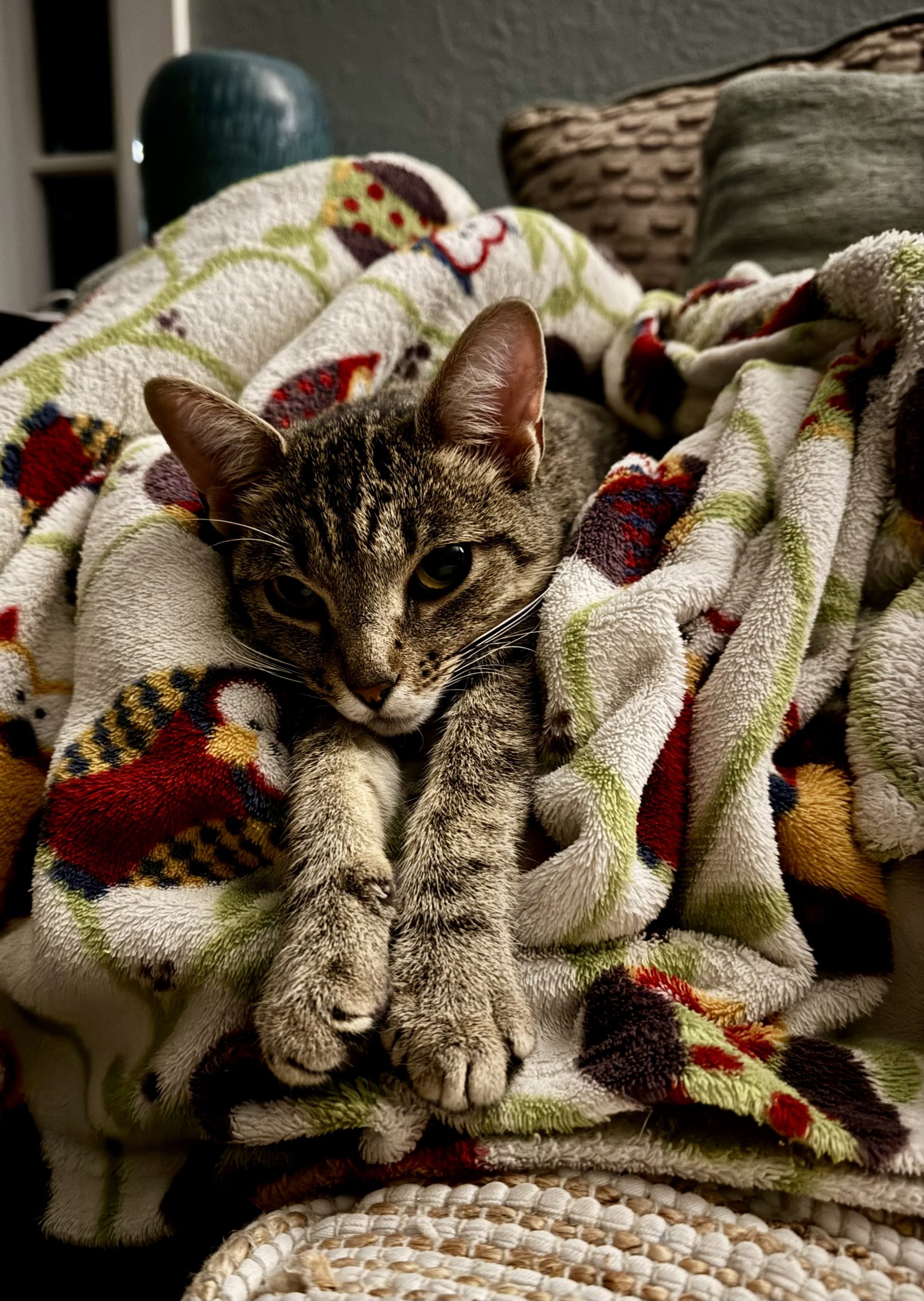 Abba is a snuggly, affectionate, quirky and playful petite cat. She loves napping in your lap, draping herself across your shoulders and burrowing as close as she can get while you sleep. She is young and gently bites during play so would be best in a home with adults or older children. She gets along with most cats and sports the cutest recently bobbed tail that still seems to surprise her when she notices it's partially missing. If you're looking for a spunky lovebug, she's your gorgeous girl.