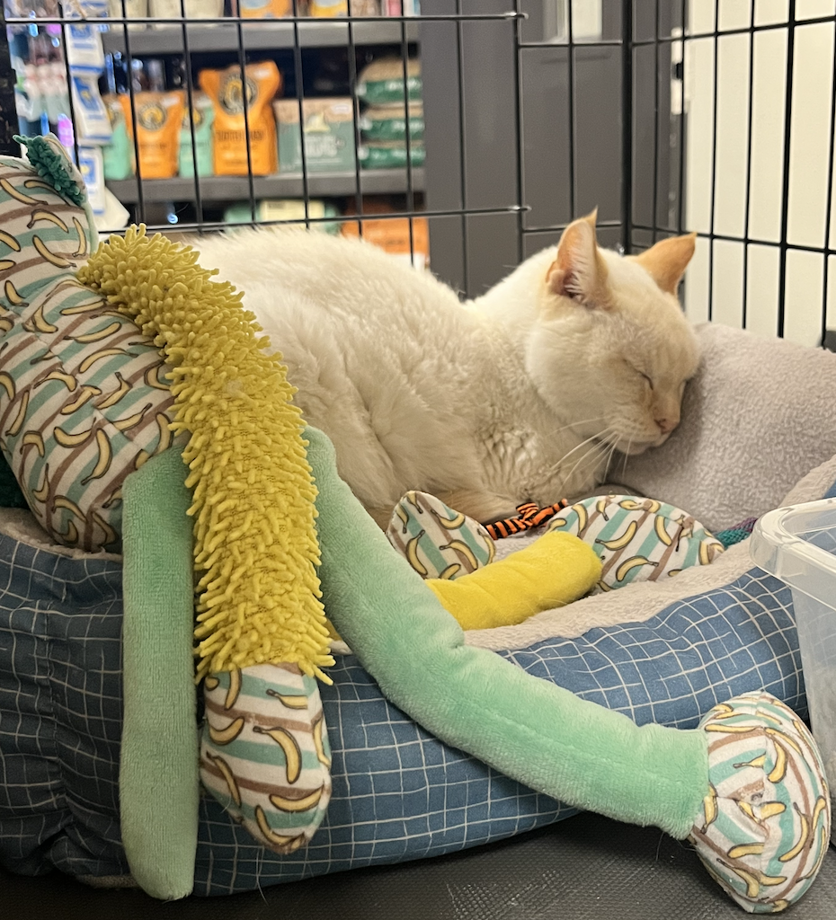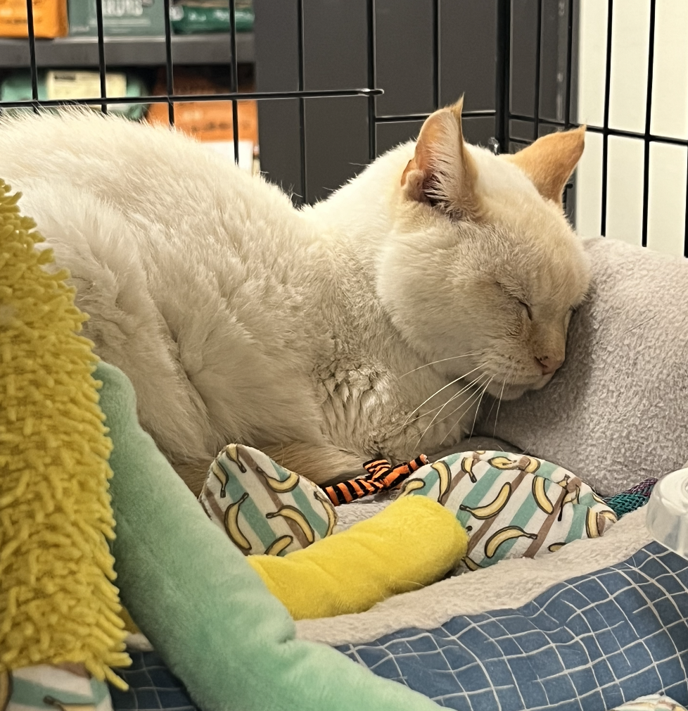 Marley is looking for a forever home to retire in! She is a sweet girl who loves pets and attention. She also loves catnip and long naps in the sun!